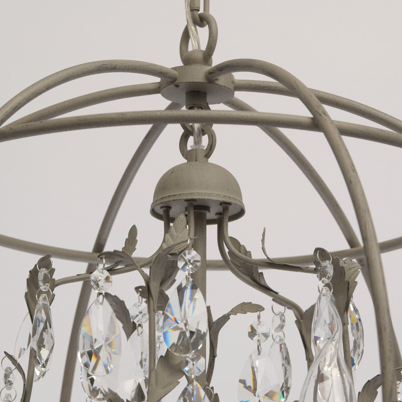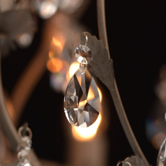 Основание выполнено из сплава металла и окрашено в серый цвет по технологии порошкового окрашивания. По технологии хай-лайт нанесены штрихи черного цвета. Потолочная чаша, корпус, декоративные элементы, декоративные розетки - прессование. Декоративный каркас, рожки - прокат на роликовом станке. Декор - прозрачный хрусталь миндалевидной формы и формы октагон.